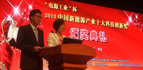2013中國新能源產業十大科技創新獎頒獎典禮于10月19日在山東棗莊會展中心隆重舉行,工信部節能與綜合利用司資源綜合利用處處長黃健忠、棗莊市政府副市長張兵與中國電源工業協會理事長季國平、北京大學教授其魯分別向獲得十大科技創新獎及十大管理創新獎的企業或企業家頒獎。